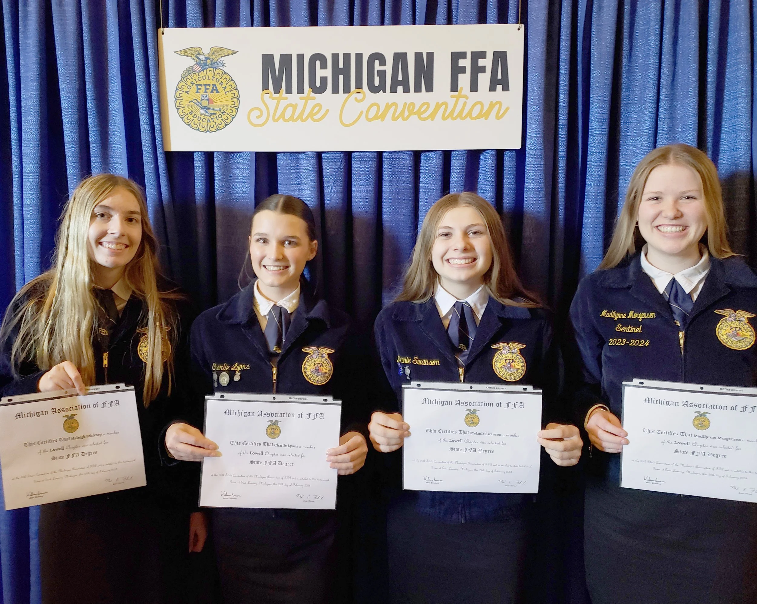 Four members from the Lowell Chapter received their State FFA Degree. The State FFA Degree is the highest award that the State Association can bestow upon one of its members and is typically awarded during the member’s senior year. Of the over 8,000 members in the Michigan FFA, only around 400 were chosen to receive this award. The Lowell FFA members that received the award were Charlie Lyons, Madilynne Morgensen, Haleigh Stickney, and Melanie Swanson.
